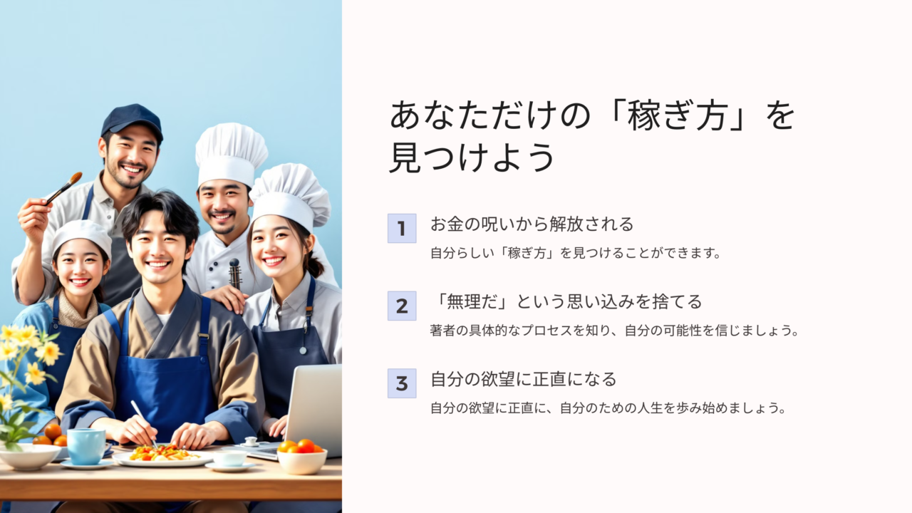 この本を読むことで、私たちは、「お金の呪い」から解放され、自分らしい「稼ぎ方」を見つけることができるでしょう。