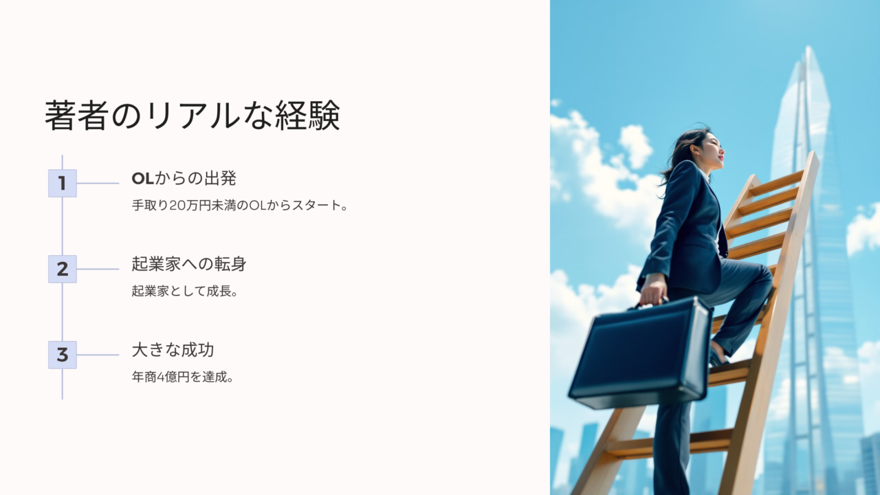 著者の小田桐あさぎさんは、手取り20万円未満のOLから、起業家として年商4億円を達成したという、まさに「リアル」な成功者。