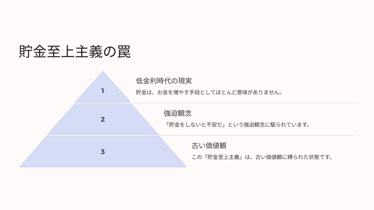 この「貯金至上主義」は、私たちを、いつまでたっても「お金に振り回される」状態から抜け出せないようにしていると言えるでしょう。