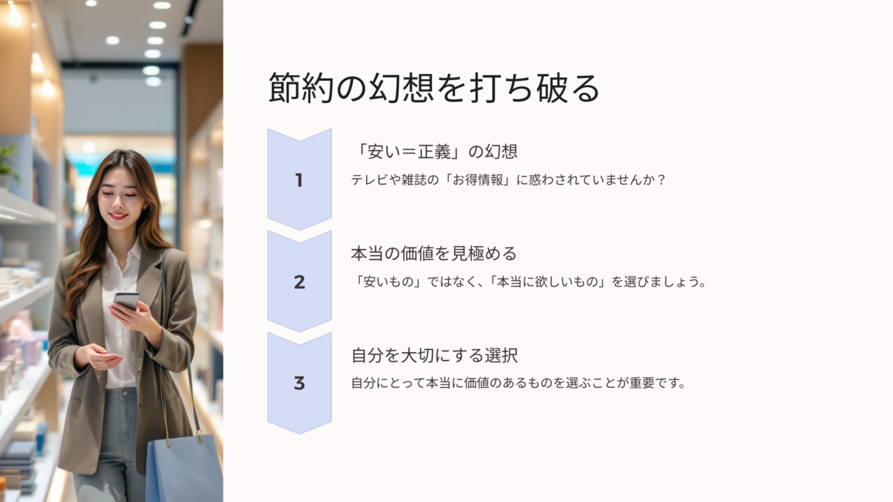 - 「節約」よりも、「自分が本当に欲しいもの」を選ぶ重要性。
