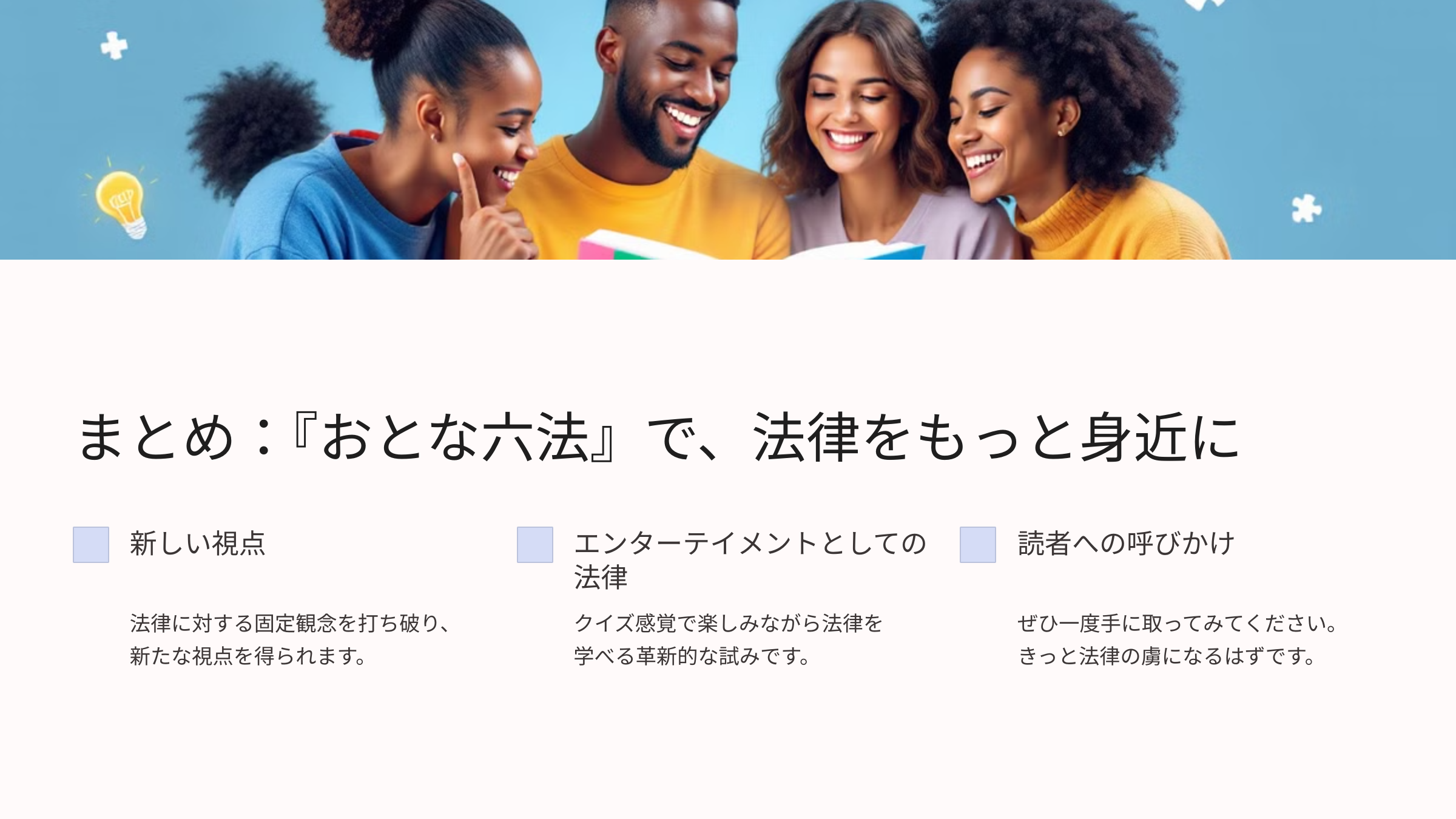 それは、「法律」を、より身近で、面白いものに変え、私たちの生活を、より豊かにするための、強力なツールです。