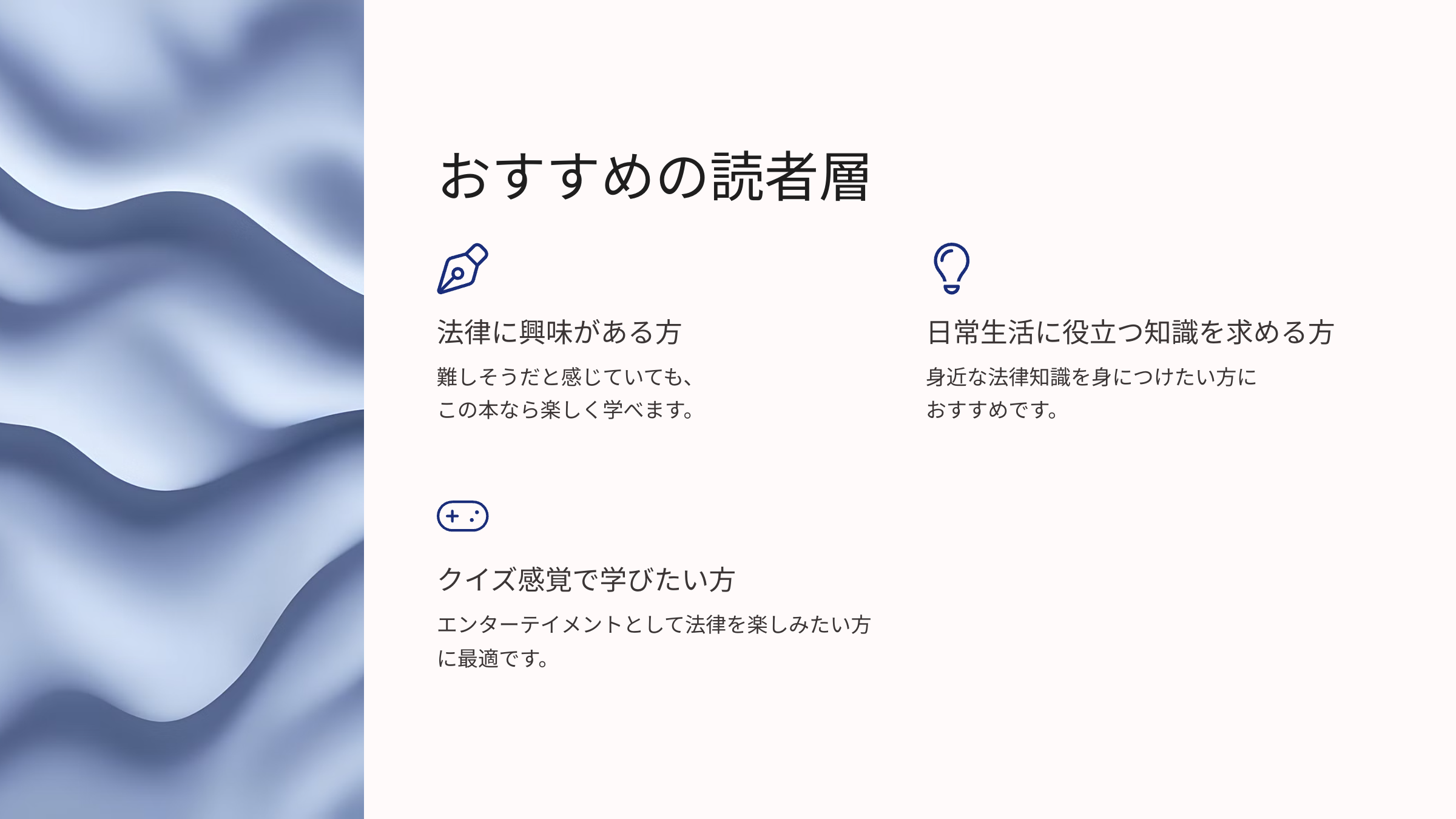 クイズ感覚で、法律を学べるので、難解なイメージのある法律も、楽しみながら、学ぶことができるでしょう。