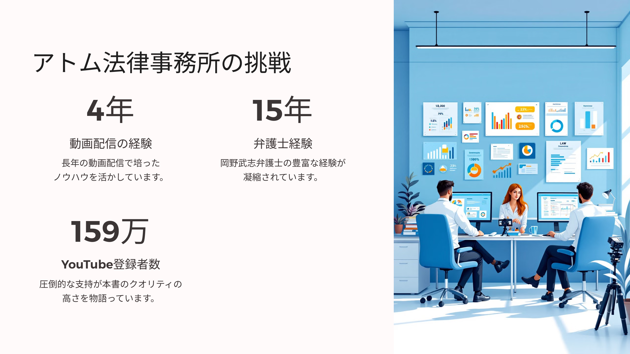 本書は、アトム法律事務所が、4年間におよぶ動画配信で培ってきたノウハウと、岡野武志弁護士の15年間の弁護士経験が凝縮された一冊です。