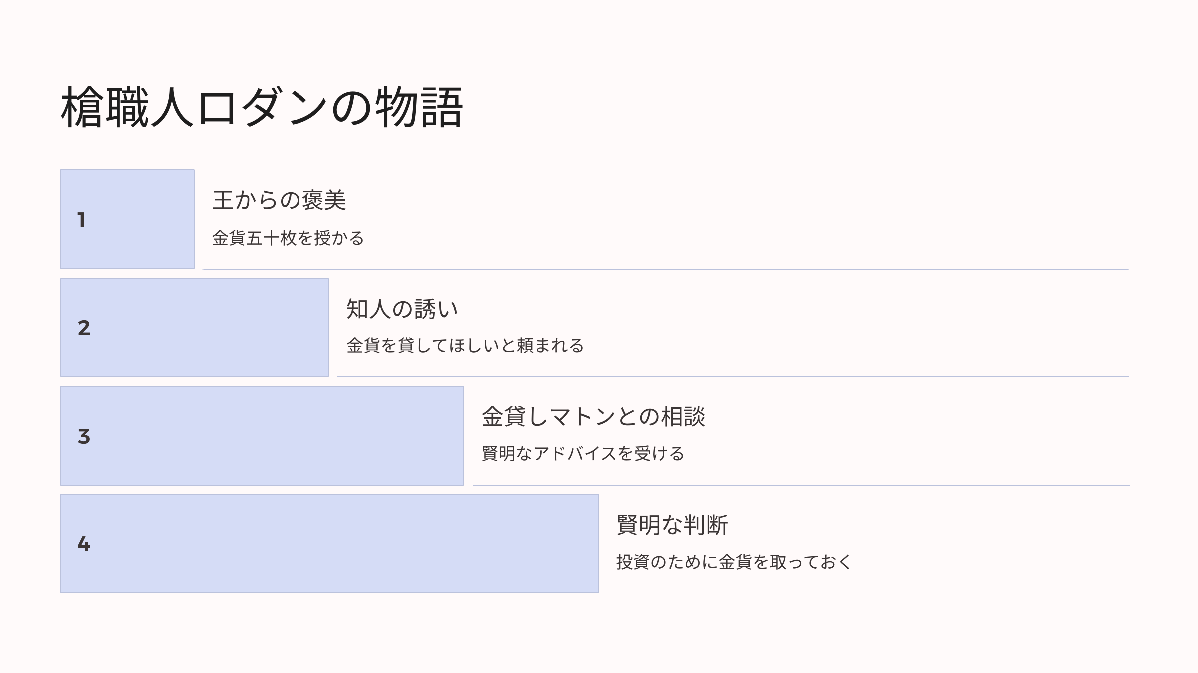 バビロンの槍職人ロダンは、新しい槍先の図案を王に献上したところ、王から金貨五十枚を褒美として授かりました。