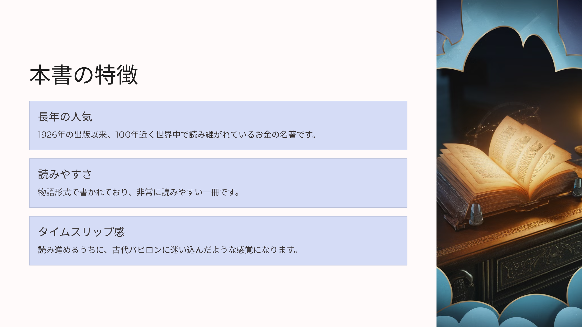 本書を読み進めるうちに、まるでタイムスリップして古代バビロンに迷い込んだような感覚になります。
