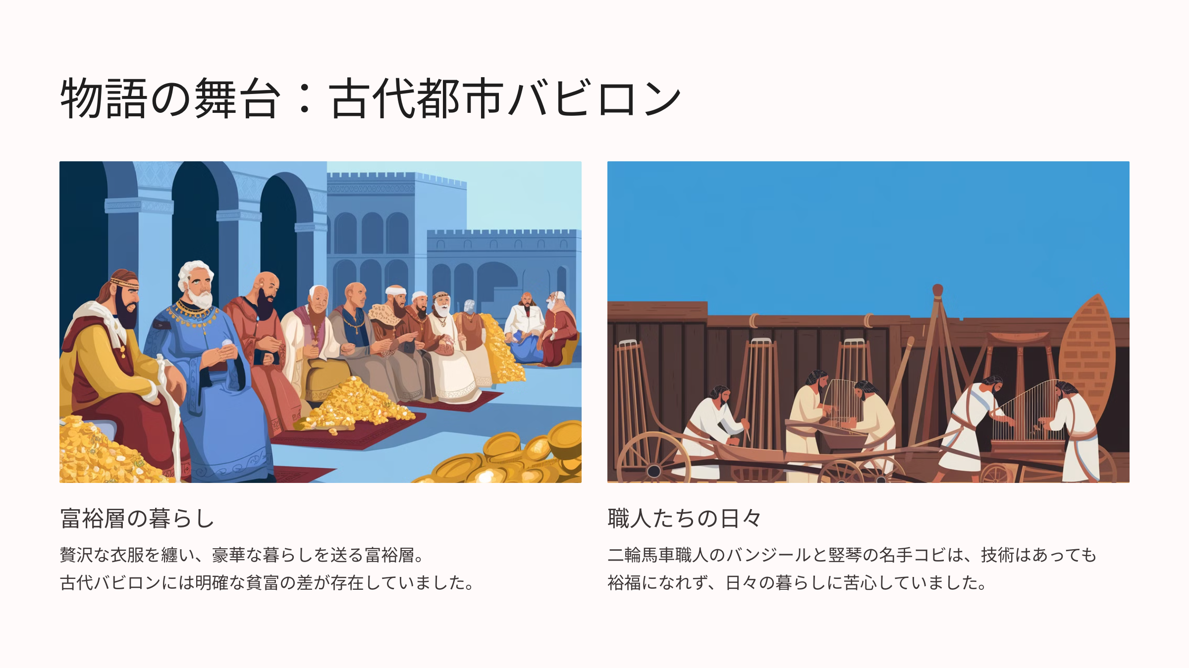 そんな二人が、バビロンで一番の大金持ちになった、共通の友人アルカドを訪ね、お金持ちになるための秘訣を教わるという物語が展開されます。