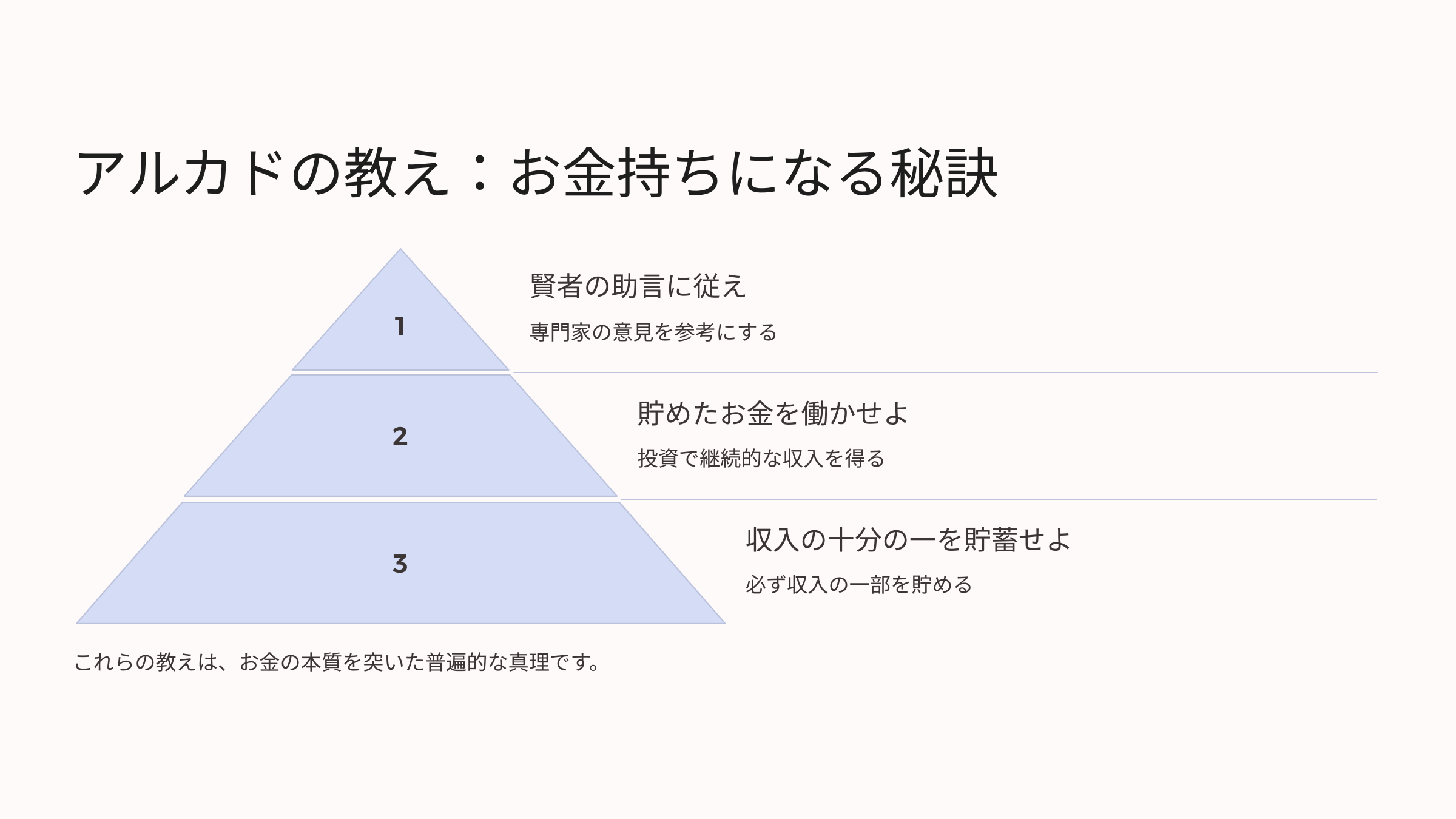 そして、アルカドに「富を築く秘訣」を人々に教えるように命じました。