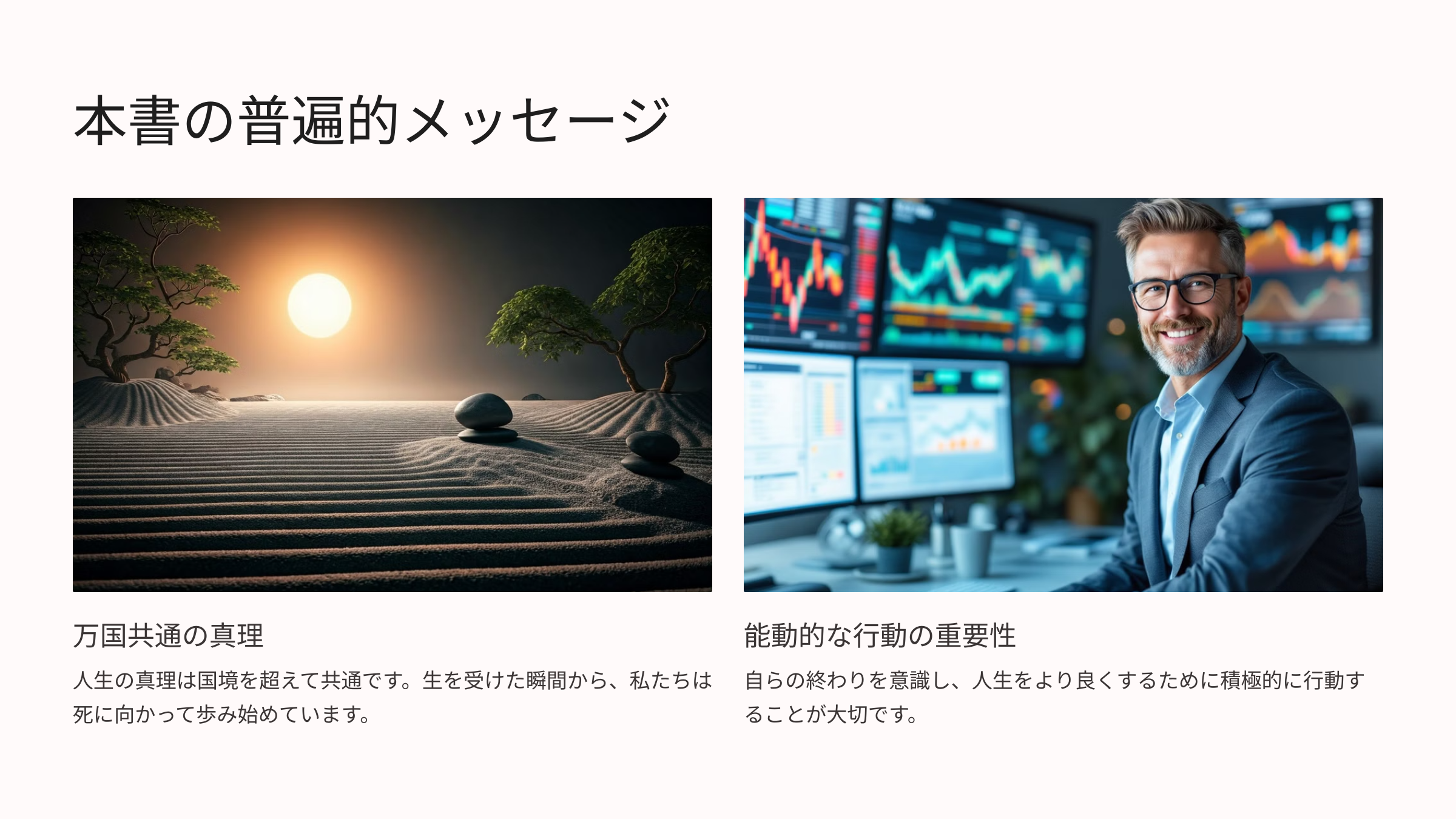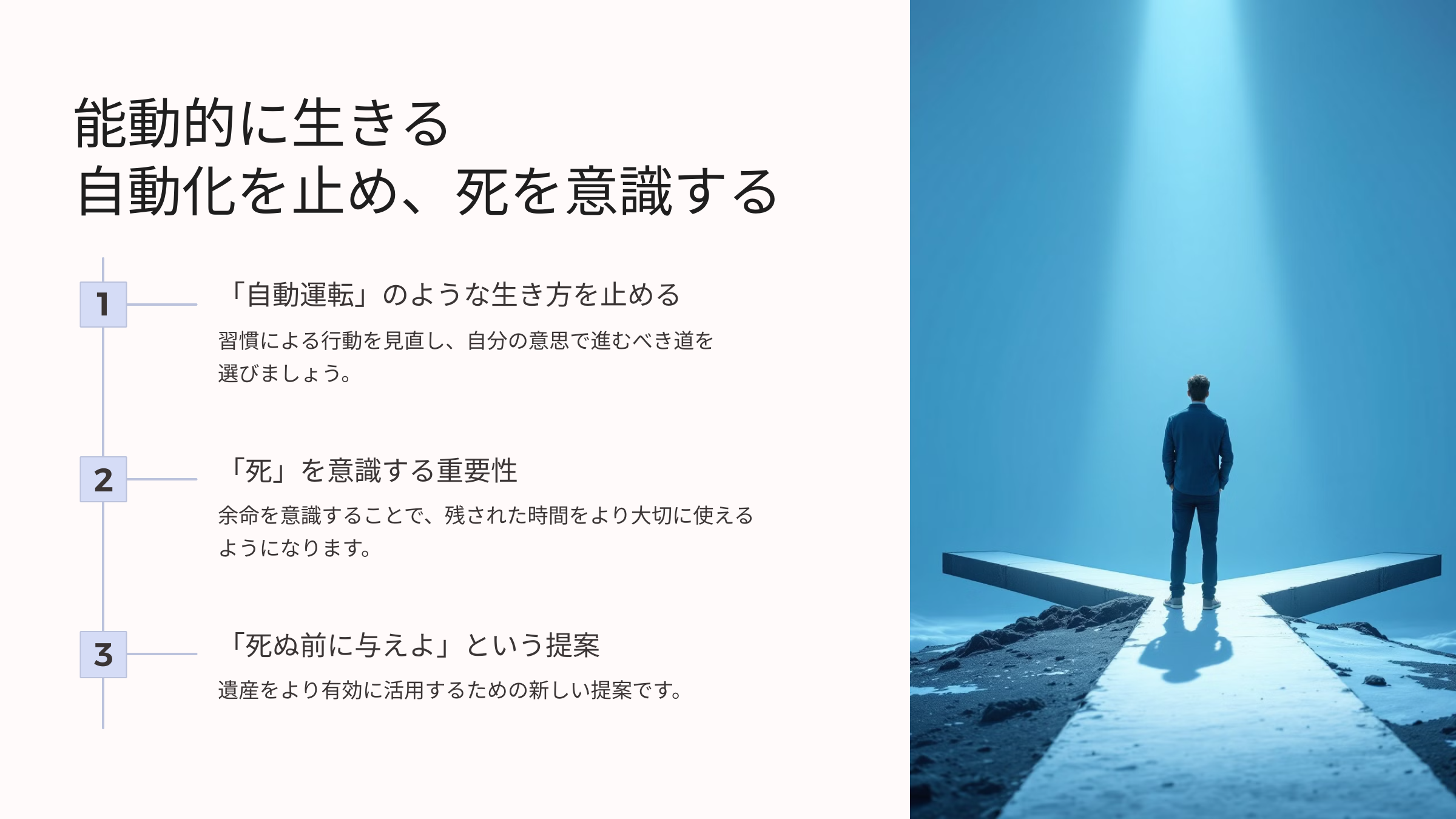 人は、生を受けた瞬間から、死に向けて一歩ずつ歩みだしており、だからこそ、自らの終わりを意識し、人生をより良くするために、能動的に行動すべきです。