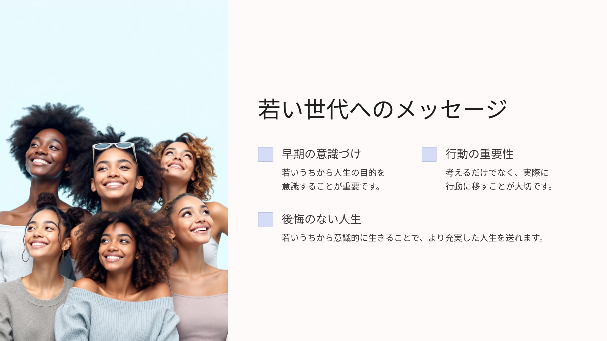 「若いうちから、人生の目的を意識し、行動する」ことで、より後悔のない人生を送ることができるでしょう。
