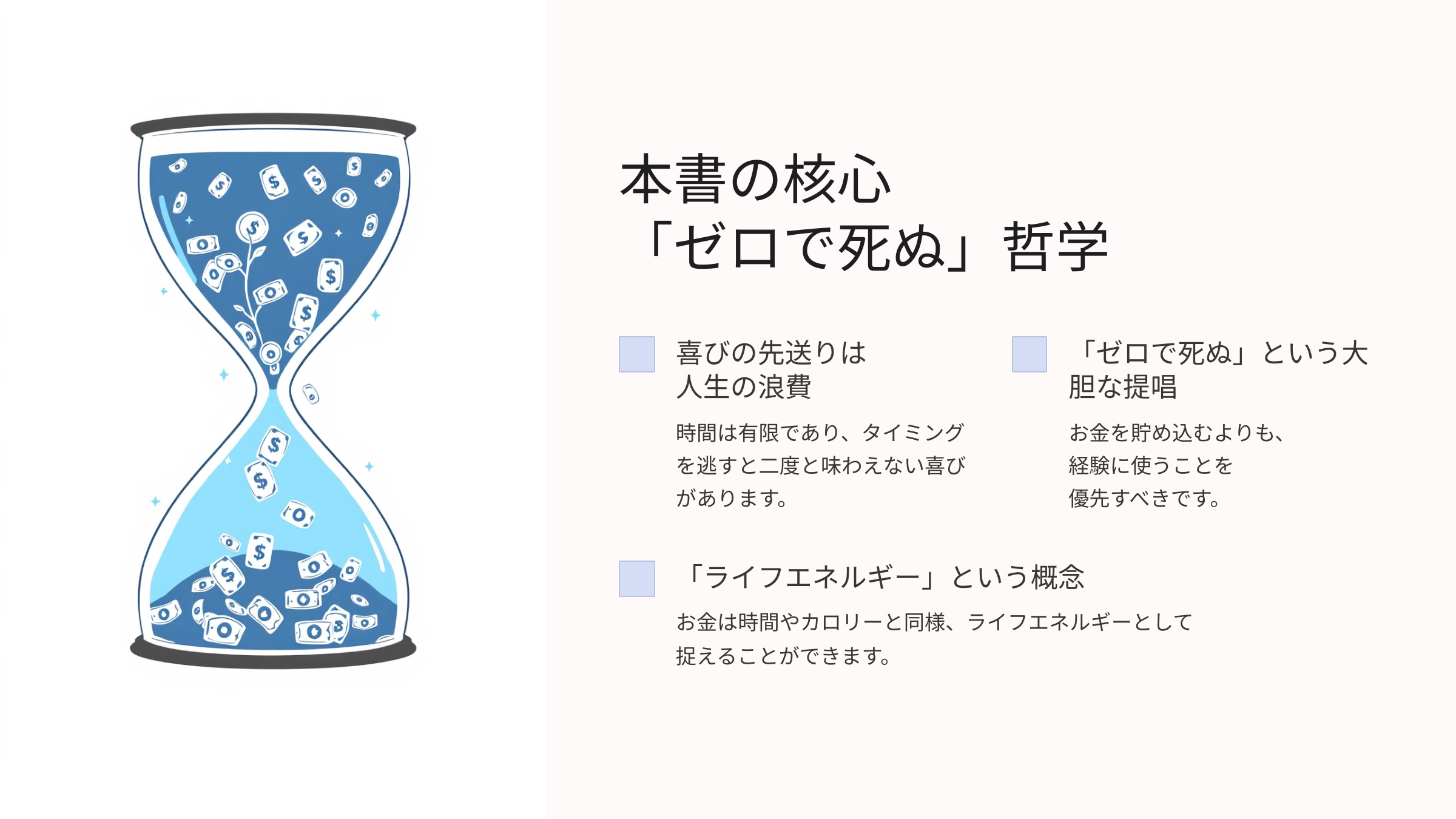 「ゼロで死ぬ」という衝撃的なタイトルが示すように、著者は、人生の目標を「富の最大化」ではなく、「経験の最大化」に置くことを提唱します。