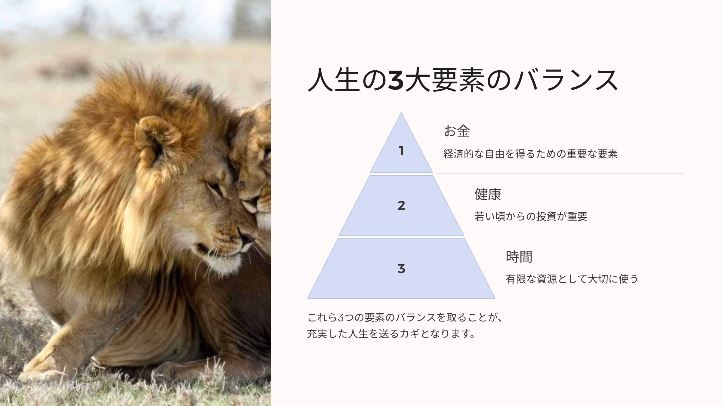 人生をより良いものにするためには、お金、健康、時間という、人生の3大要素のバランスを、いかに取るかが、重要になります。