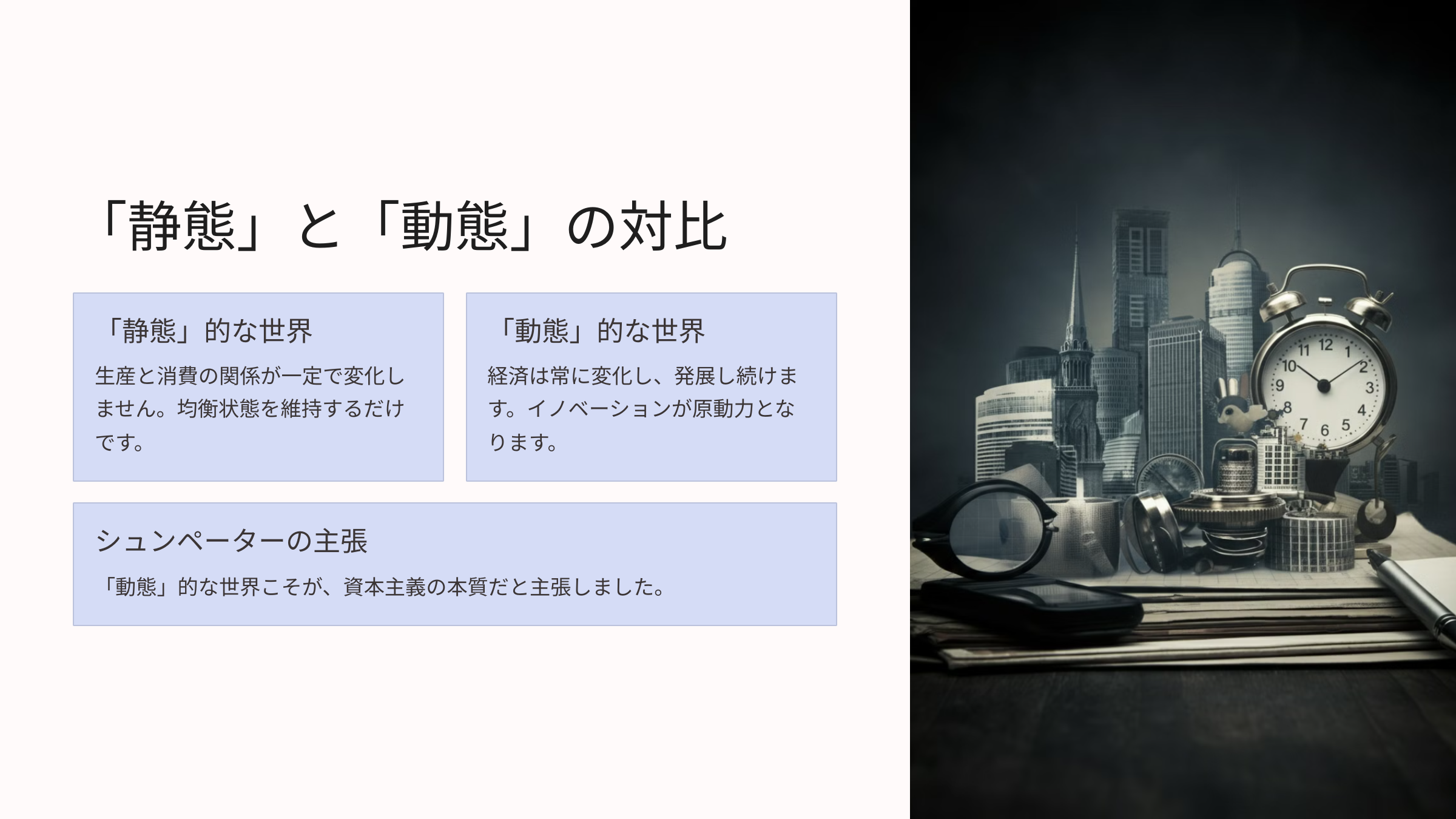 シュンペーターは、この「動態」的な世界こそが、資本主義の本質だと主張しました。