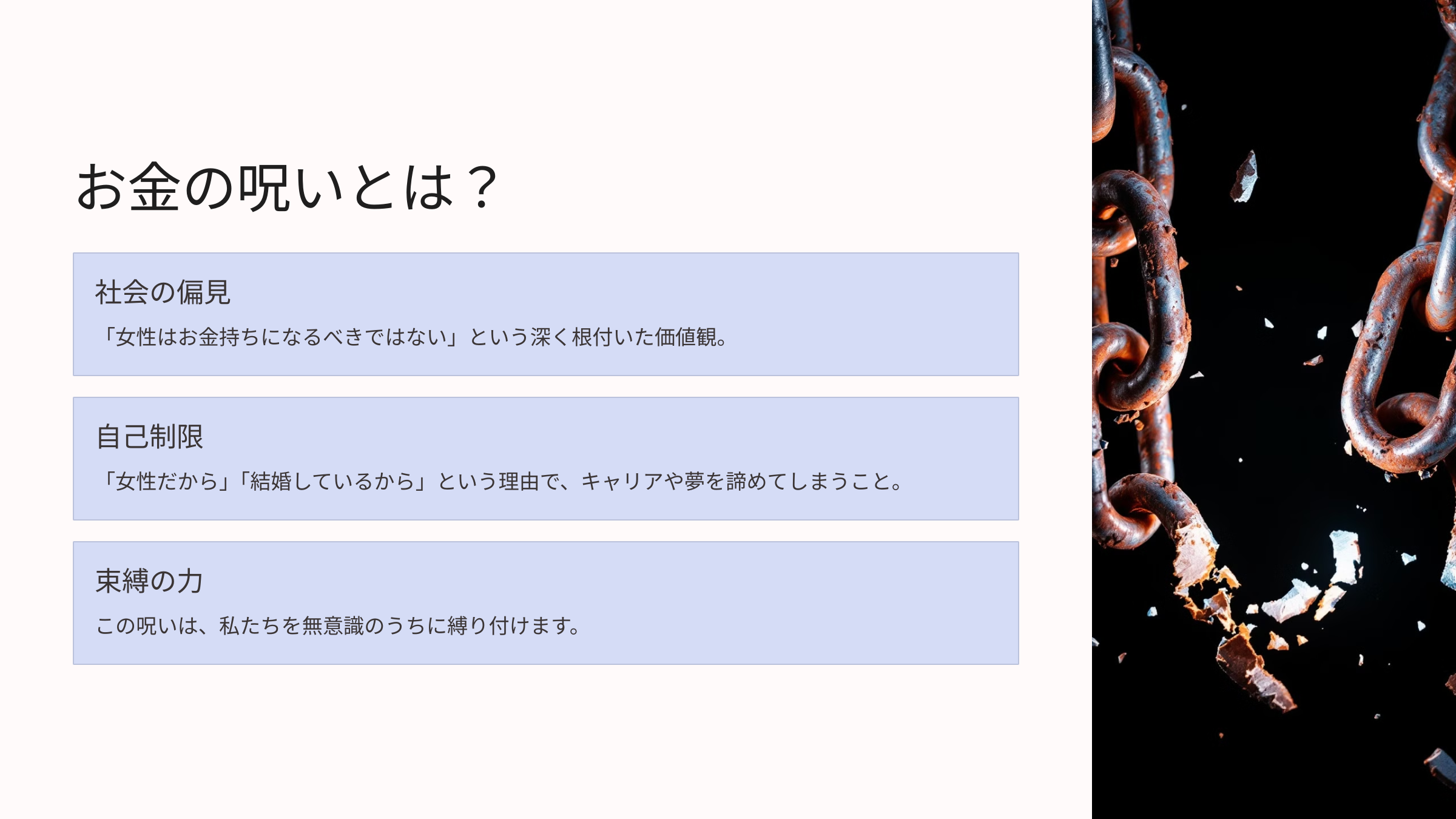 それは、「女性はお金持ちになるべきではない」という、社会に深く根付いた、偏った価値観のことなのです。