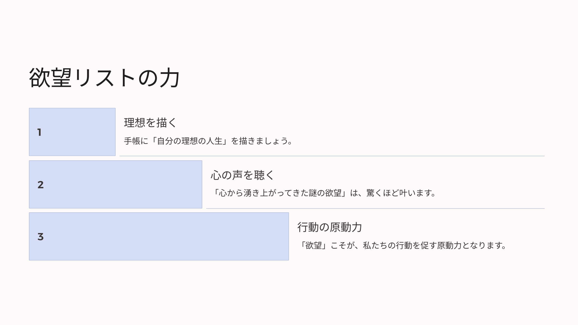 著者は、「夢リスト」ではなく、「欲望リスト」を作ることを推奨します。