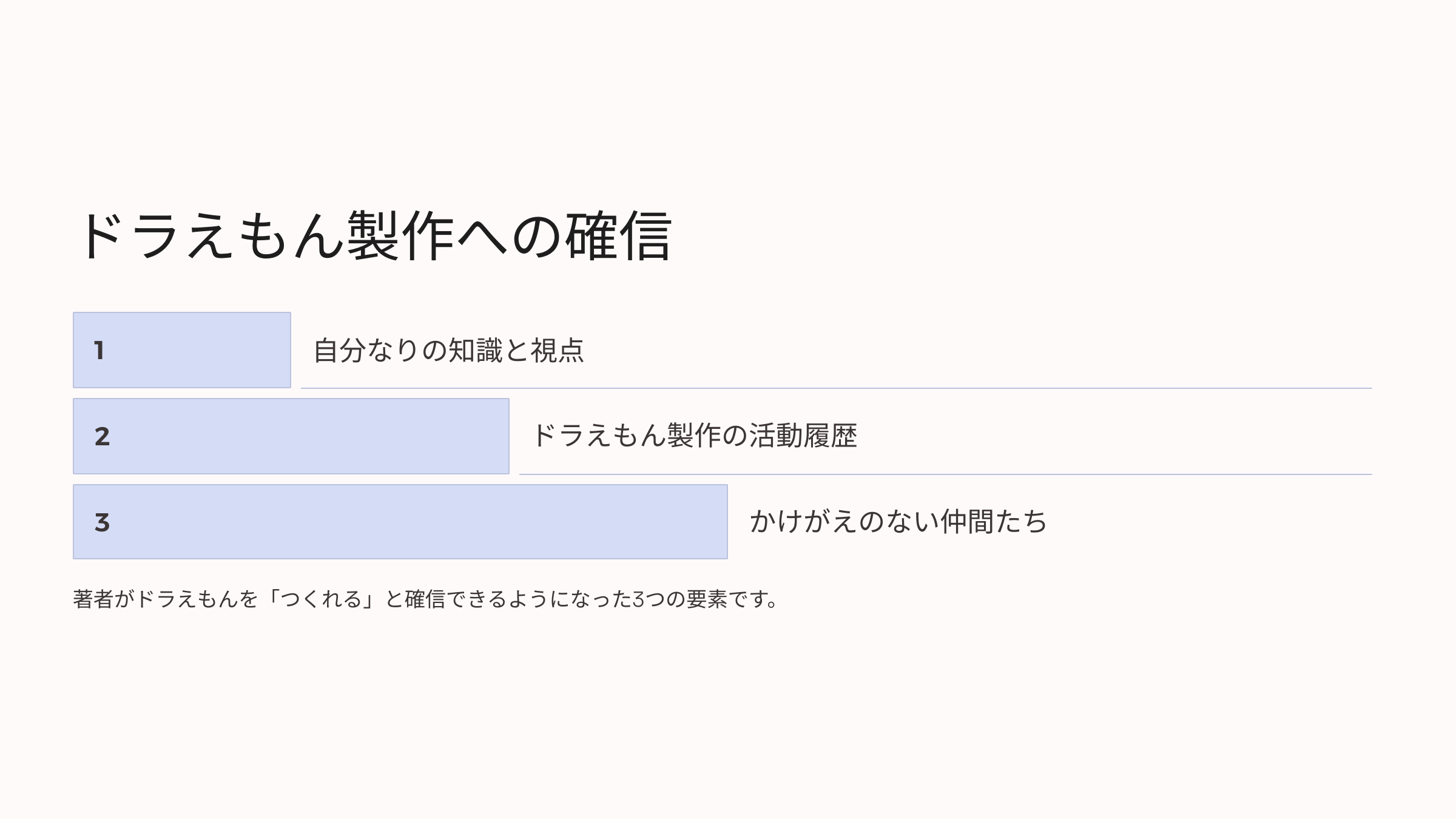 1つ目は、自分なりの知識と視点、2つ目は、ドラえもん製作の活動履歴、そして3つ目は、かけがえのない仲間たちの存在です。