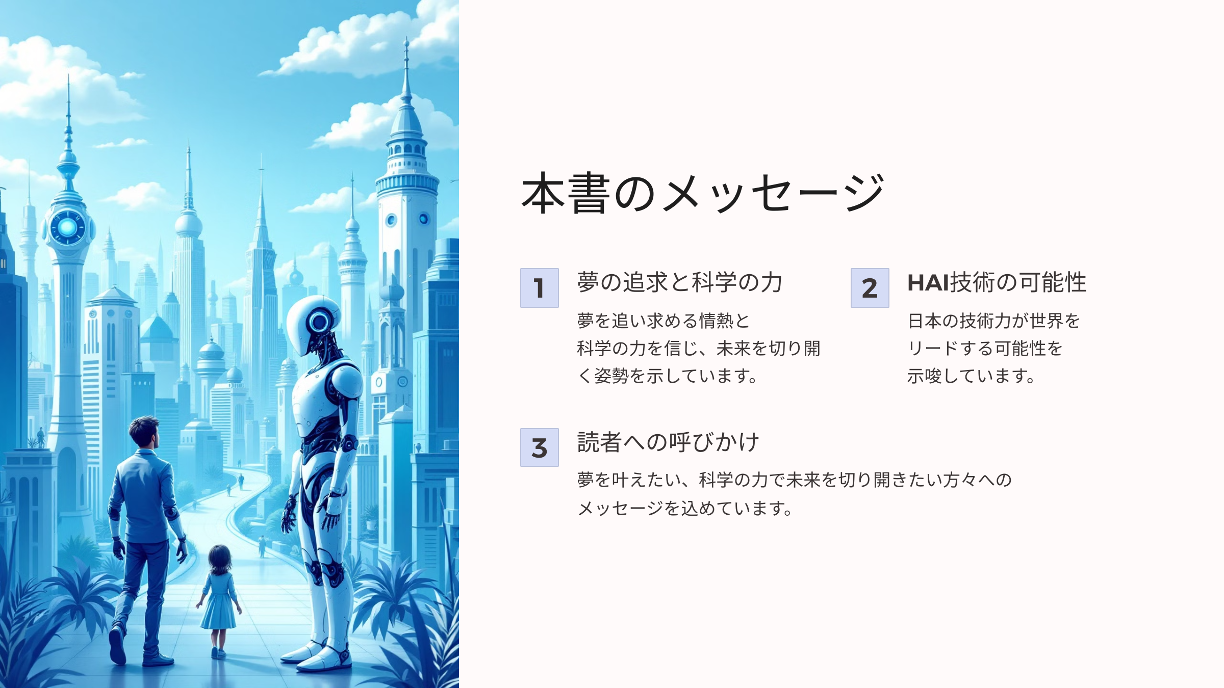 本書では、特にHAI(ヒューマン・エージェント・インタラクション)技術に焦点を当てることで、AIの可能性を広げ、日本の技術力が世界をリードする可能性を示唆しています。