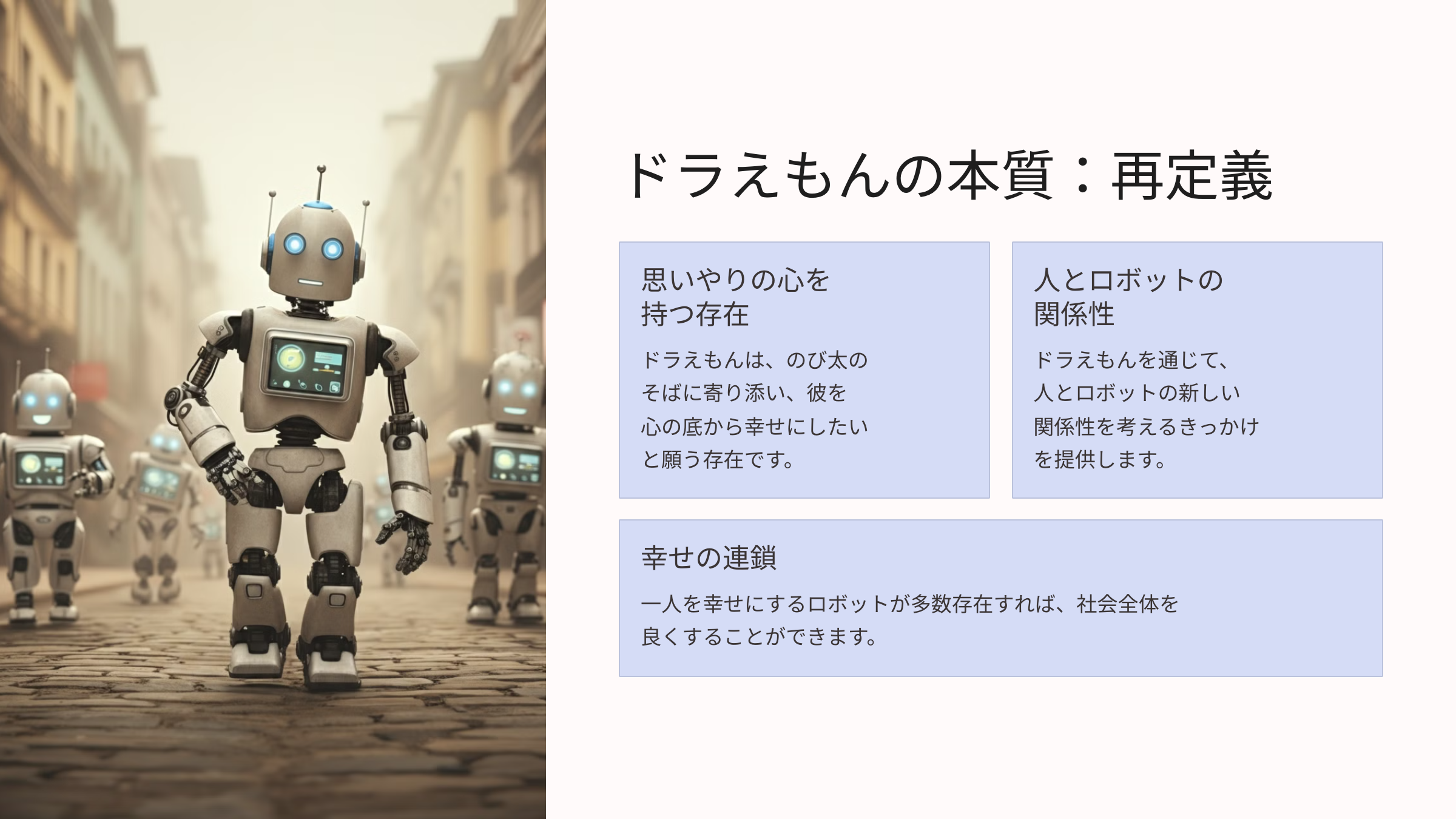 ドラえもんは、単に便利な道具を四次元ポケットから取り出す未来のロボットではなく、「いつも、のび太のそばに寄り添い、彼を心の底から幸せにしたいと願う、まさに心を持った存在」だと定義しています。