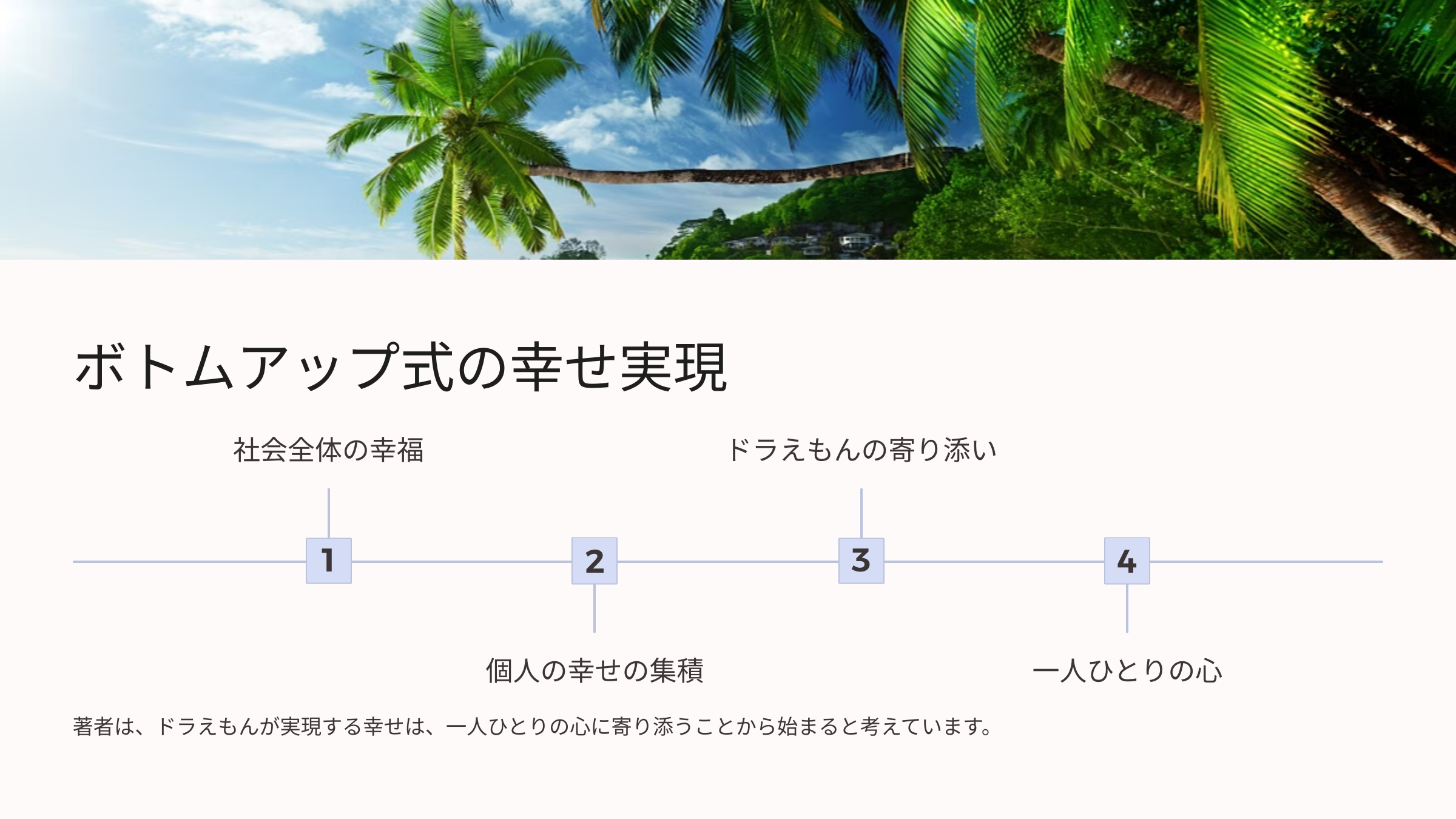 ドラえもんが実現する幸せは、社会の仕組みを根本から変革して、人を幸せにするような「トップダウン式」ではなく、ドラえもんが、一人ひとりの心に寄り添い、その結果として、社会全体が良くなっていく、まさに「ボトムアップ式」だと、著者は考えています。