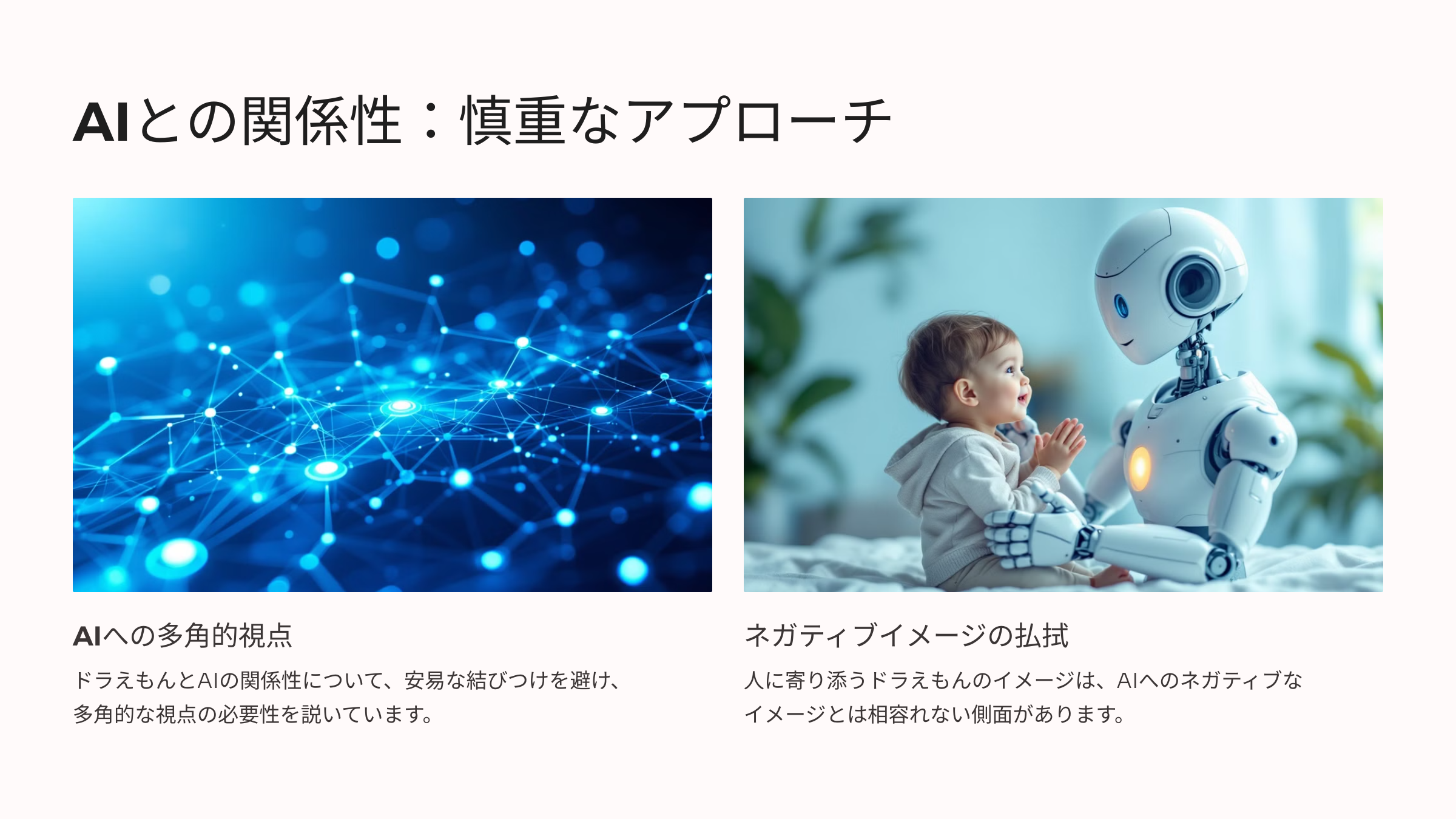 ドラえもんの、「人に寄り添い、心を通わせる」というイメージは、「支配されそう」といった、AIに対するネガティブなイメージとは、相容れない側面があるからです。
