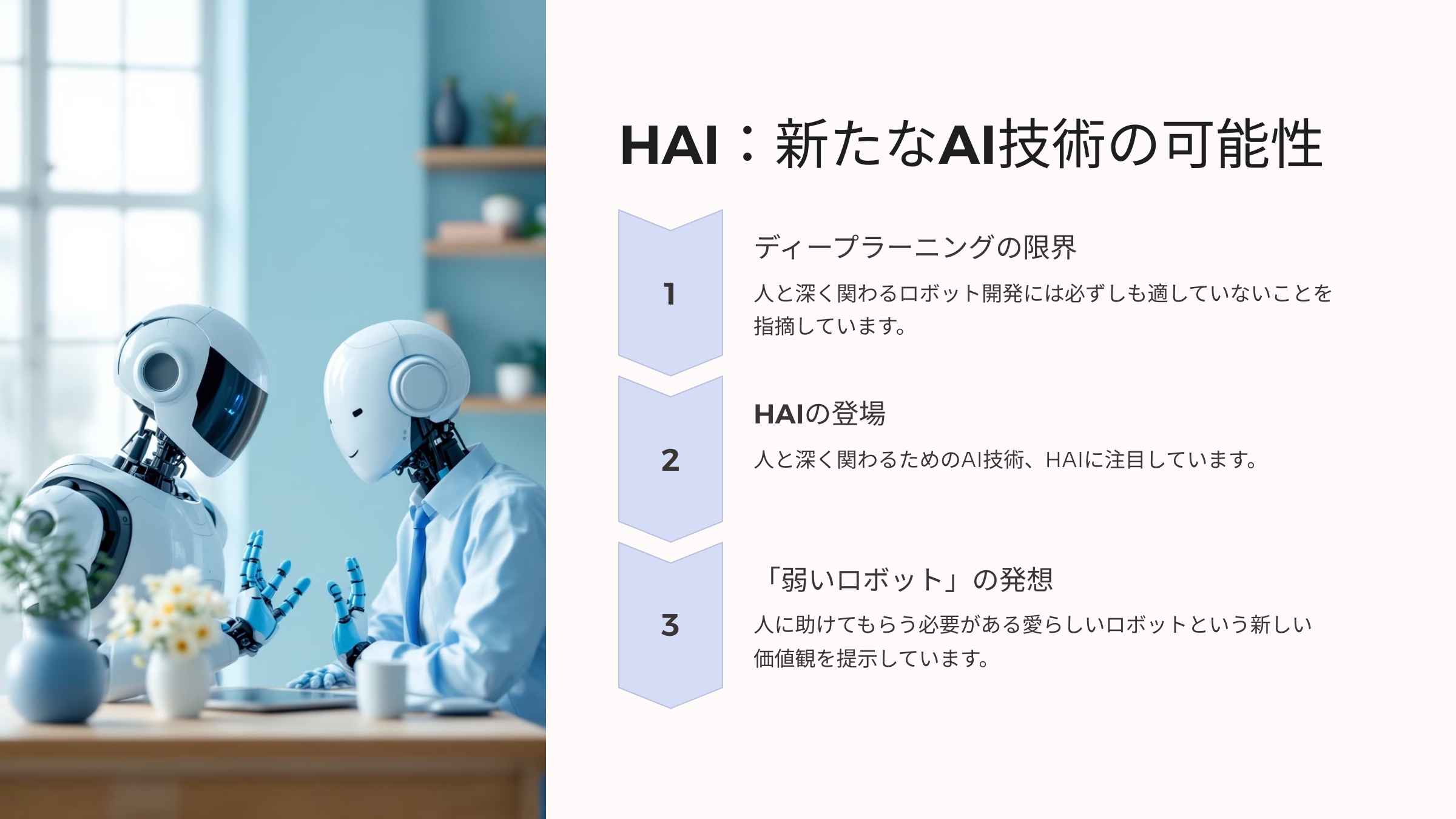 特に、AI研究の最前線で注目される、ディープラーニングとは異なるアプローチ、「HAI(ヒューマン・エージェント・インタラクション)」という技術に着目している点が、革新的です。