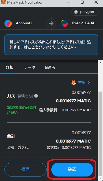 数秒後にメタマスクの確認画面が開きますので、ガス代を確認して確認ボタンをクリックします
