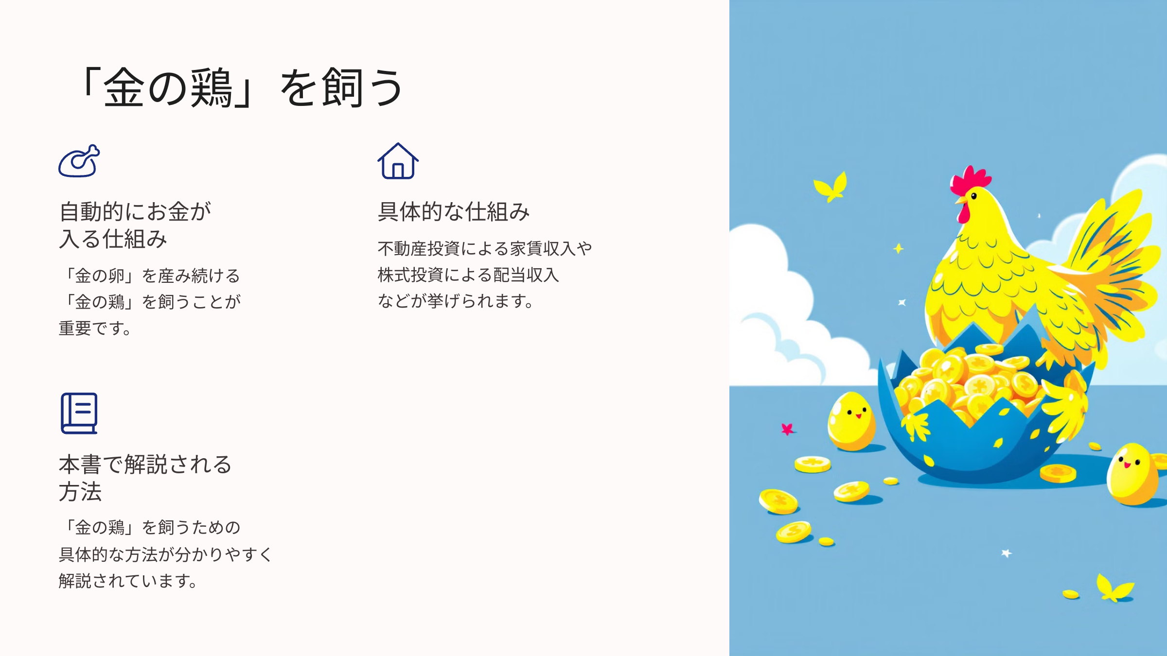 本書では、このような「金の鶏」を飼うための具体的な方法が、分かりやすく解説されています。