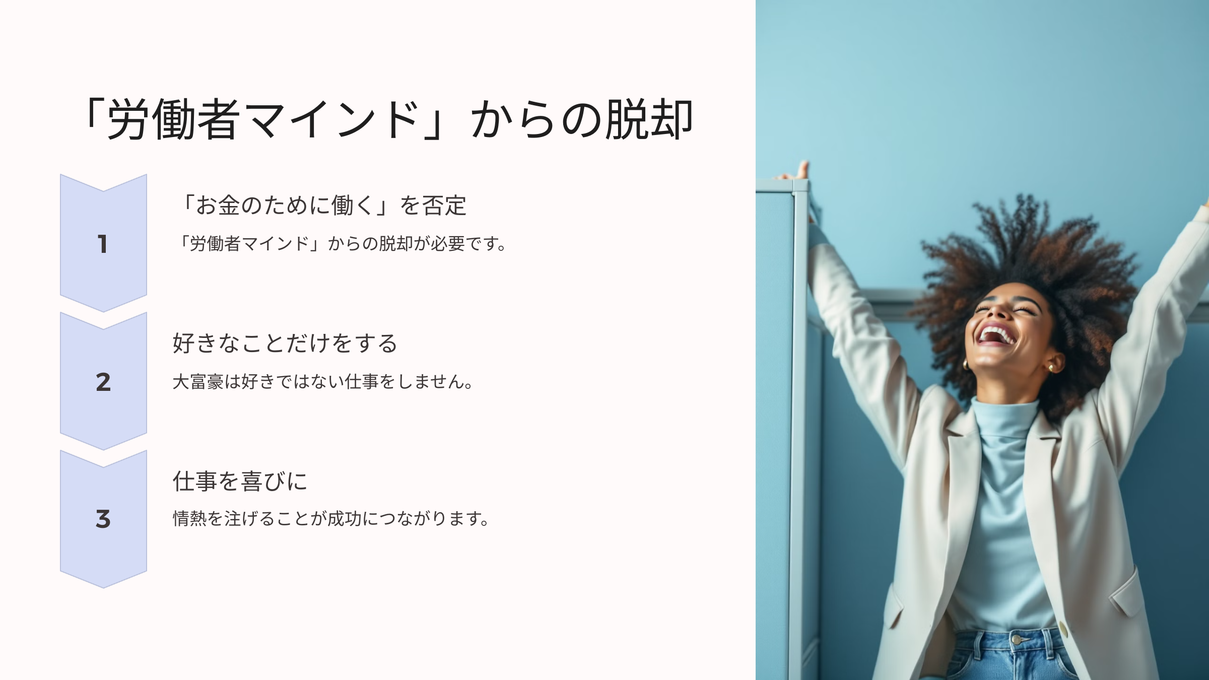 本書では、「お金のために働く」という考え方を、「労働者マインド」と呼び、これを否定しています。